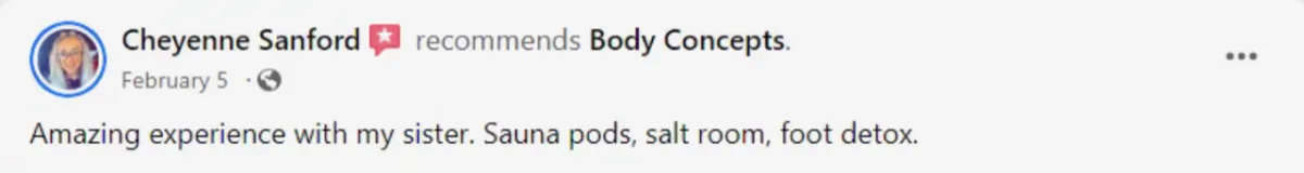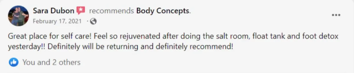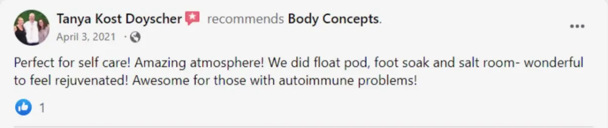 “I love the sauna pods, foot Detox, massage and salt room, too! Pure relaxation when I'm there! Thanks for a little piece of heaven in my day!